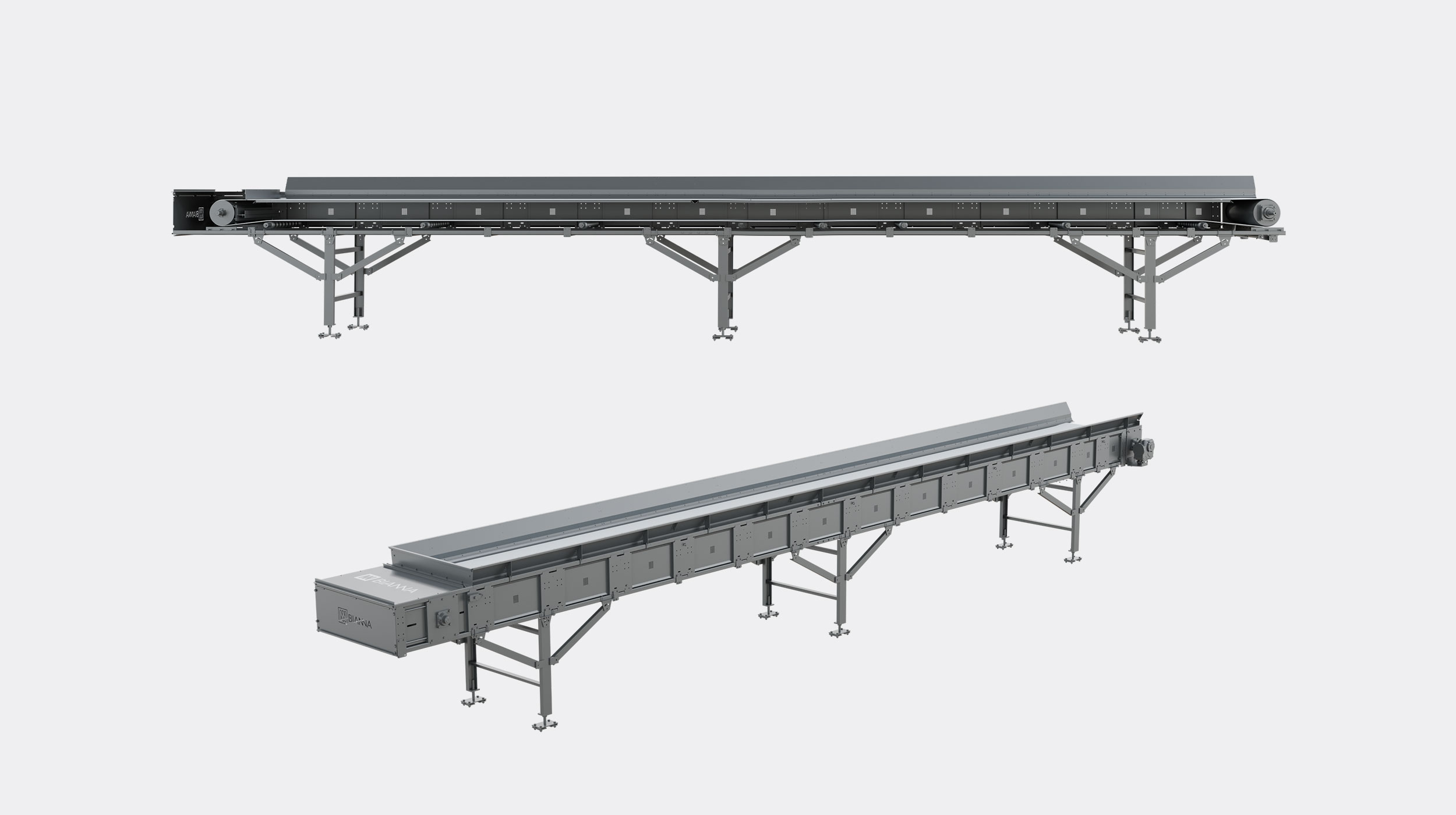 Consisten en una amplia gama de sistemas de transporte (bandas sobre chapa, sobre rodillos, de cadenas o de lamas metálicas) fabricados con componentes de primeras marcas. La oferta de Bianna cubre desde transportadores estándar hasta soluciones especiales diseñadas por su departamento técnico para necesidades complejas.