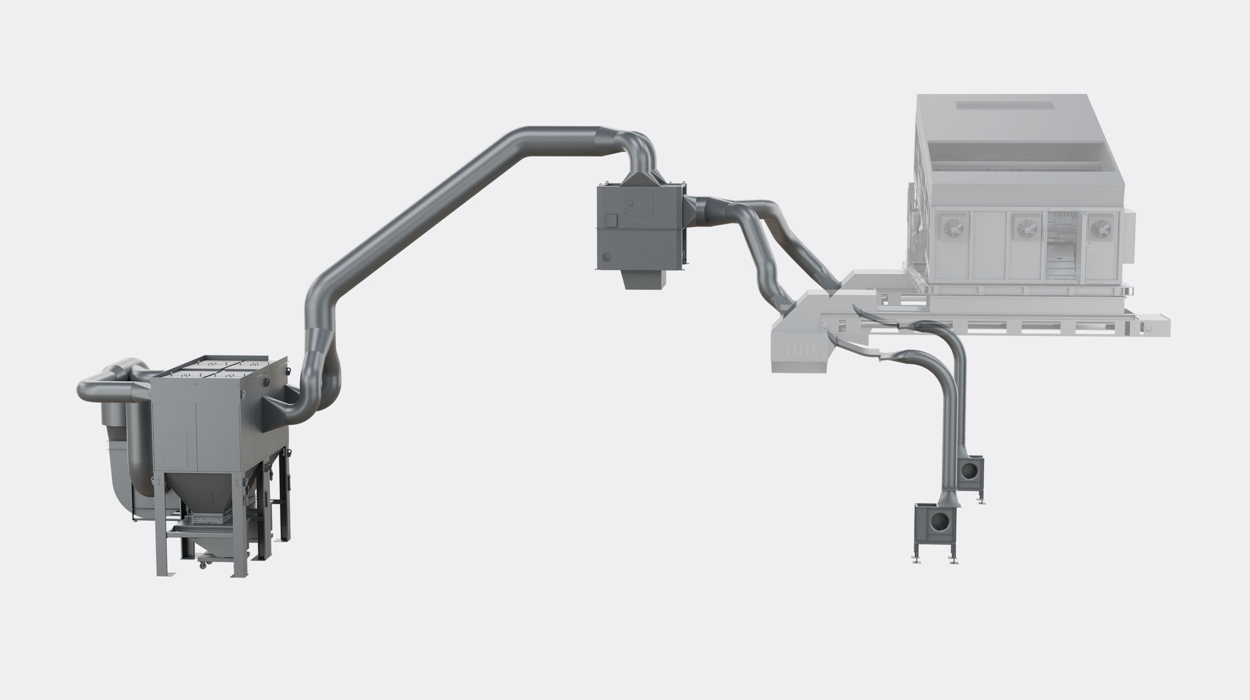 Una vez el plástico entra en la tubería, un ventilador centrífugo de alta potencia lo transporta hasta el condensador de válvula rotativa (o disco rotativo). Allí, el plástico sólido es decantado y separado del flujo de aire, cayendo por gravedad. Finalmente, el aire con partículas en suspensión es conducido a un filtro de mangas donde se limpia antes de ser recirculado nuevamente al inicio del proceso para la impulsión