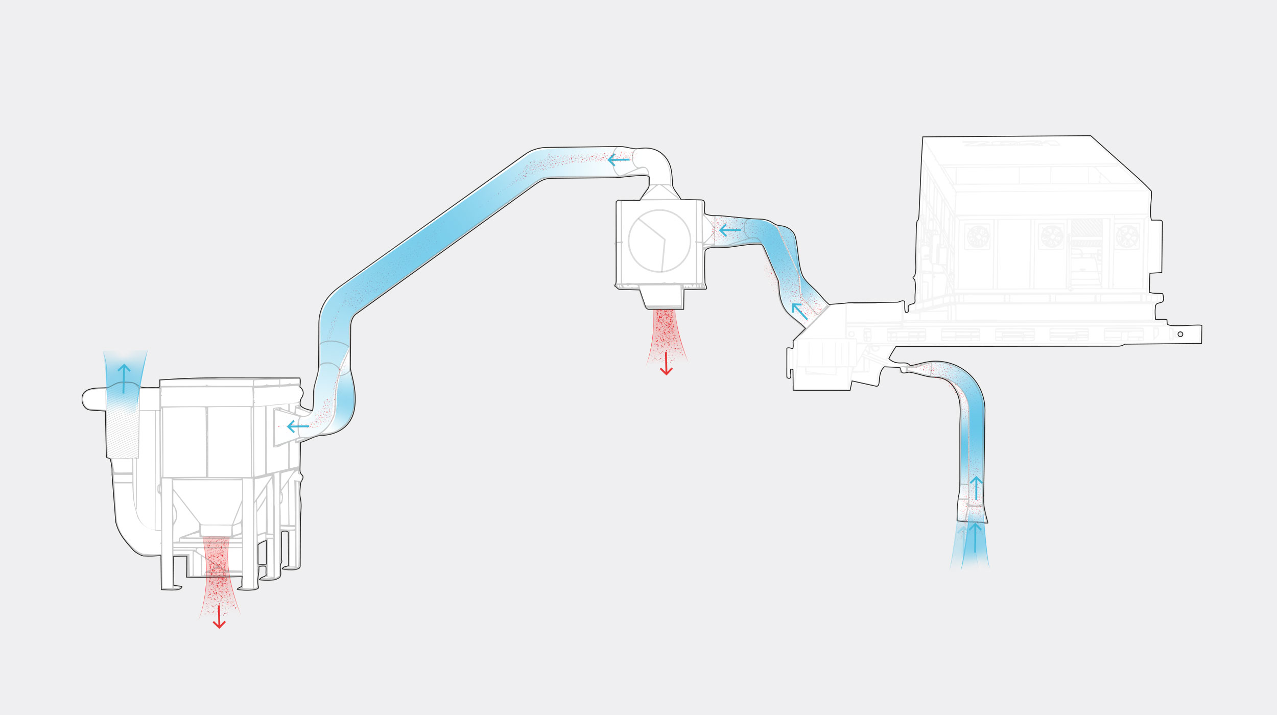 El funcionamiento se basa en un cálculo preciso aerodinámico. En la cabina de aspiración, situada en el salto de material, se cuenta con una boca de soplado (que impulsa aire recirculado) y una boca de succión que están perfectamente alineadas. La impulsión de aire ayuda a que el plástico ligero dibuje una parábola perfecta hacia la captación. Un deflector interior ajustable optimiza aún más este recorrido.
