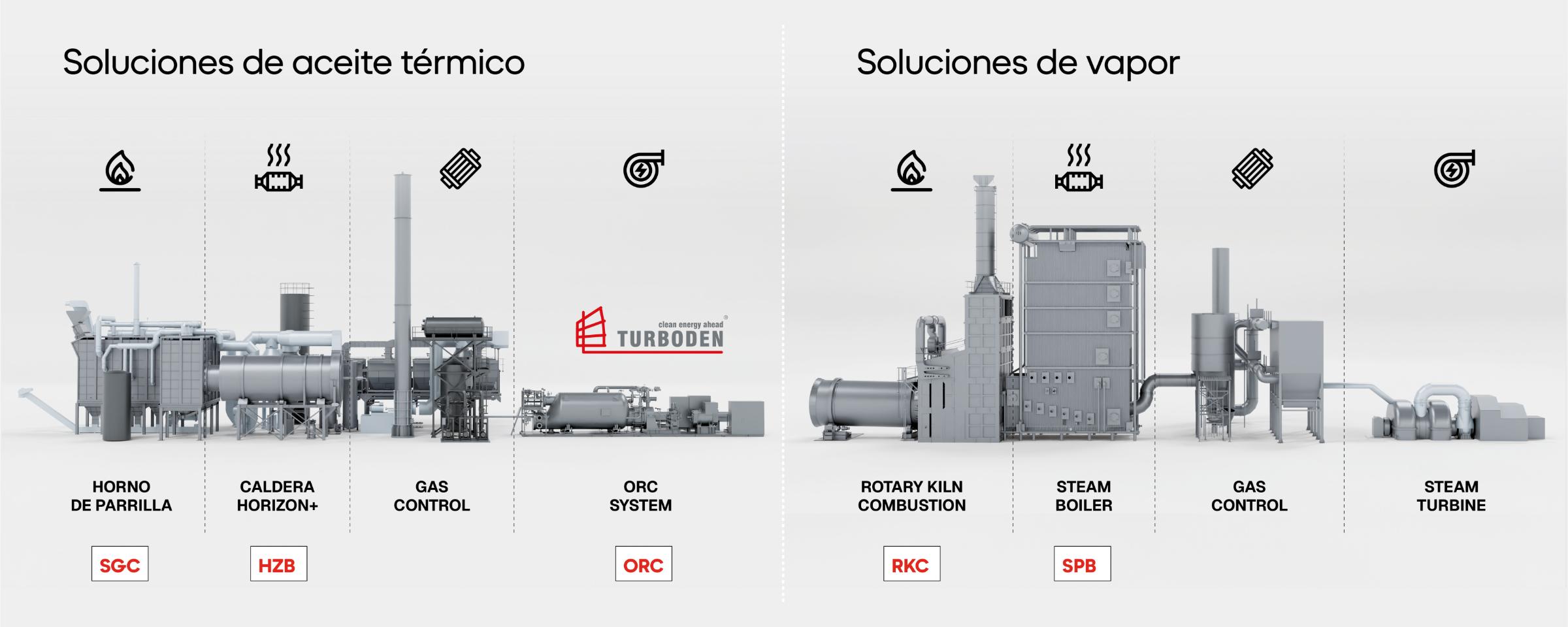 • BIO (Biomasa y fracción orgánica recuperada): soluciones diseñadas para industrias con residuos susceptibles de aprovechamiento energético. Mediante tecnología puntera, estas plantas logran la combustión de combustibles complejos (hasta un 50% de ceniza y 70% de humedad), transformando la biomasa en un recurso energético estable para industrias papeleras, químicas y madereras.